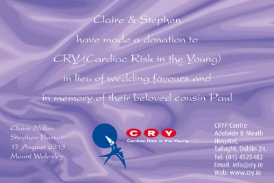 Claire Nolan and Stephen Barrett were married on 17 August 2013 and celebrated with family and friends in Mount Wolesley. They made a generous donation to Cry in lieu of wedding favors – in memory of their beloved cousin Paul Cusack who died suddenly in November 2012.