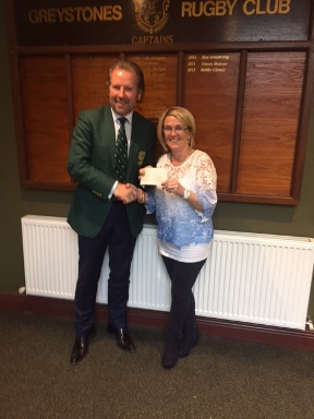 Lucia Ebbs went to the Club on Saturday 2nd April ahead of their AIL game –v- Sundays Well RFC. Club Chairman Gary Nolan and Rachel Byrne from Greystones Ladies Team welcomed Lucia & John Ebbs to the Club and the President Fintan O’Hagan presented Cry with €2,200.00 – the monies raised at this year’s Ladies Day Event.