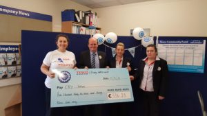 Pictured recently in Tesco Ireland – Newcastlewest, Limerick is Clare O’Donovan (Monagea) collecting €536.23 as part of the Community Fund. Pictured with Clare are Donal Claffey, Store Manager, Amanda Dalton, Checkout Manager and Sara McMullan, Stock Control Manager.