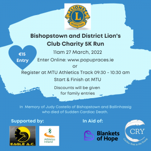 Join Bishopstown & District Lions Club for their 1st Annual 5K Charity Run taking place at 11am on Sunday 27th of March.