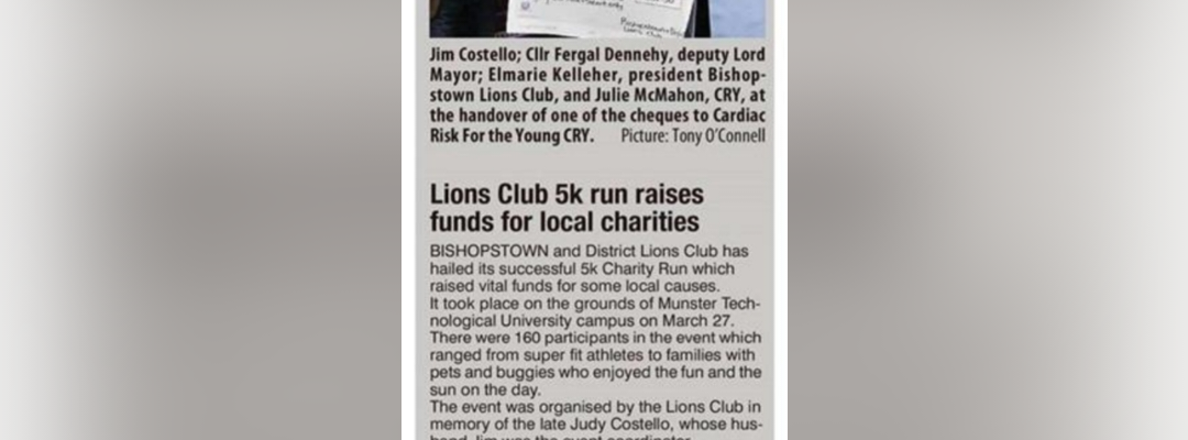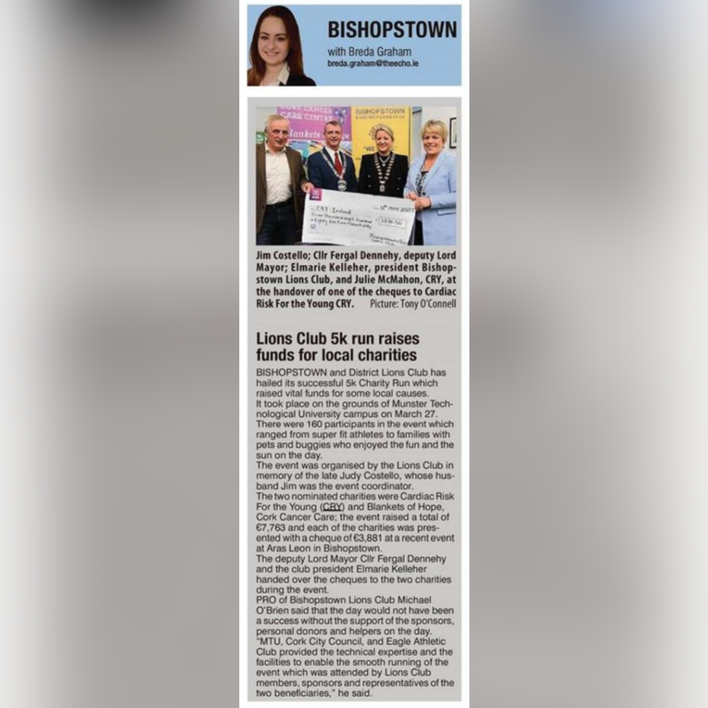Bishopstown Lions held their inaugural 5K run on March 27th and chose to support CRY Ireland and Blankets of Hope, Cork Cancer Centre, in memory of Judy Costello.  Read the details here ;