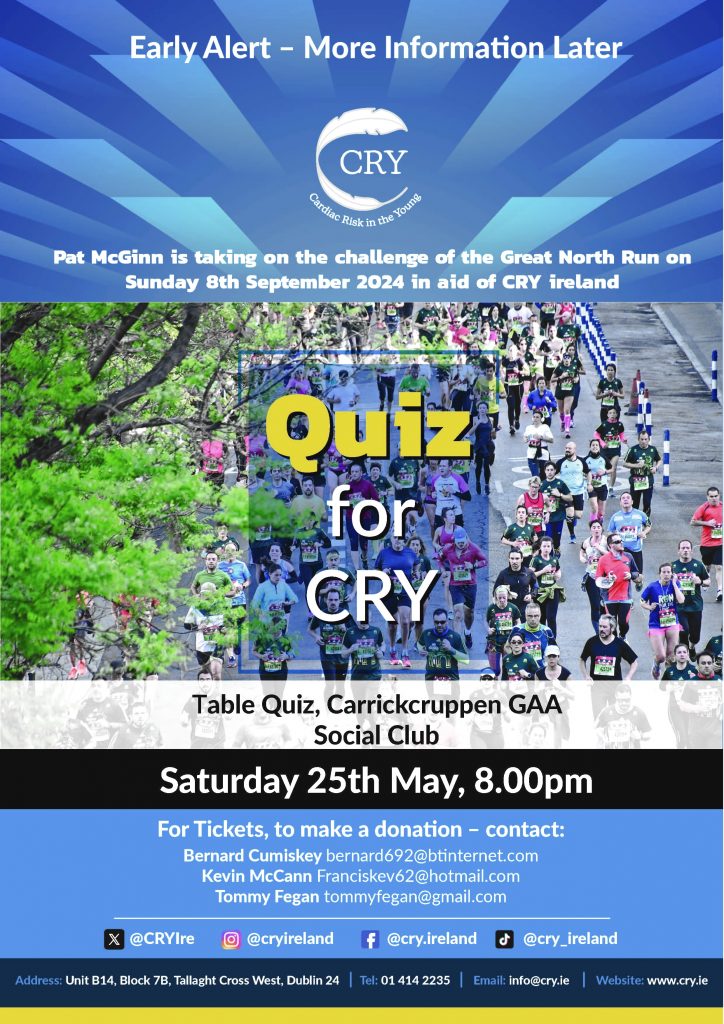 As part of his fundraising, supported by Bernard Cumiskey, Kevin McCann and Tommy Fegan he’s hosting a Quiz for CRY on Saturday 25th May at 8.00pm in Carrickcruppen GAA.