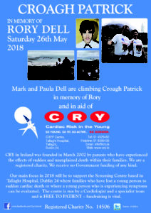 Huge thanks to Mark Carrick and Paula Dell who have confirmed their annual climb is back again - this year on Saturday 26th May. Supported by family and friends they'll climb Croagh Patrick in memory of Rory who died suddenly on 22nd November 2012. It really is a tough challenge - a little about what