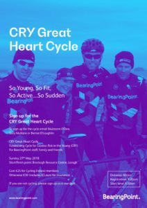 The CRY Great Heart Cycle is on Sunday 27th May 2018 To sign up for 60K in the Wicklow Hills email [email protected] and join #teamCry Start & Finish Point is the Brockagh Resource Centre and Registration at 9:00am. Cost - €25 for Cycling Ireland Members Otherwise €30 to include Insurance. Proudly Supported by BearingPoint.