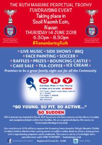 The Ruth Maguire Perpetual Trophy Fundraising event is taking place in Scoil Naomh Eoin, Navan on Thursday 14th June from 6:30 to 8:30pm, Remembering Ruth Maguire and Cry and very proud to be once again their chosen charity for this incredible community event.