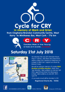 On Saturday 21st July Brendan Hoare, Mike O’Sullivan, John Flynn and Shane Flynn will be cycling from Brandon in West Kerry to Lisheen in West Cork in memory of cousins Mark Houlihan & Brian Houlihan. A huge personal challenge and we’re very proud to have you each of you on #teamCry