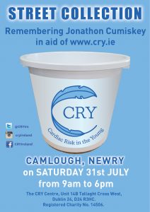 On Saturday 31st July the Cumiskey family will be on the streets of Camlough, Newry with a Street Collection in aid of CRY remembering Jonathon who died suddenly in July 2018. They’ll be in Camlough from 9am to 6pm – please support. #Charity #RememberingJonathon