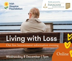 Our friends in the Irish Hospice Foundation are hosting their #LivingWithLoss event online this year on Wednesday 8th December at 7pm. It is free to attend – please see more here; https://hospicefoundation.ie/livingwithloss