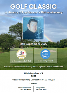 Golf Classic on 16th September 2022 remembering Paul Stewart On Friday 16th September Paul Stewart will be remembered on his 18th anniversary by family and friends and they’re holding a Golf Classic in Beaverstown Golf Club. 18 holes Open – Teams of 4 €200.00 Putting Competition & Prizes Galore! Contact Amanda on 087 8464393