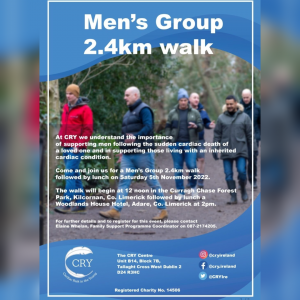 At CRY, we understand the importance of supporting men following the sudden cardiac death of a loved one and also in supporting those living with an inherited cardiac condition. ᴄᴏᴍᴇ ᴀɴᴅ ᴊᴏɪɴ ᴜꜱ ꜰᴏʀ ᴀ ᴍᴇɴ’ꜱ ɢʀᴏᴜᴘ 2.4ᴋᴍ ᴡᴀʟᴋ ꜰᴏʟʟᴏᴡᴇᴅ ʙʏ ʟᴜɴᴄʜ ᴏɴ ꜱᴀᴛᴜʀᴅᴀʏ 5ᴛʜ ɴᴏᴠᴇᴍʙᴇʀ 2022. The walk will begin at 12
