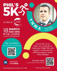 On Saturday 18th March Philip McLoughlin’s family are organising a 5K event – you can walk, run or jog) to celebrate Philip’s life and support CRY. Philip died suddenly in Australia on November 7th, 2021. See more here; #RememberingPhil #Phils5K #Walk #Jog Run #YNWA #OurFantasticFamilies #FriendsOfCRY