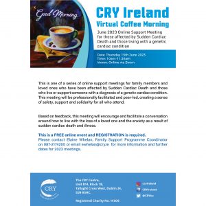 Online Coffee Morning Support Meeting Our final online coffee morning of this series will be held on Thursday 15th June where we will encourage and facilitate a conversation around how to live with the loss of a loved one and the anxiety as a result of sudden cardiac death and illness. For further