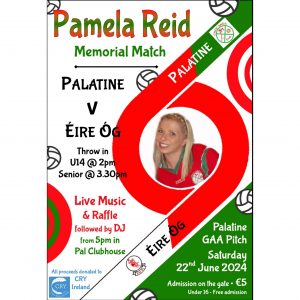 Palatine v- Eire Og, remembering Pamela Reid. Weโre back in Carlow 0 throw in U4 @ 2pm, Seniors at 3.30. Live Music from 5pm in the Clubhouse. Huge thanks to the Clubs for their continued support and thank you to the community for their generosity in getting behind this annual event in aid of CRY,