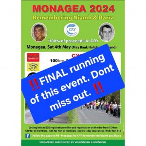 (っ◔◡◔)っ ♥ Monagea, Remembering Niamh and Darra ♥ Monagea 2024 takes place on Saturday 4th May (May Bank Holiday Weekend). Two cycling options – a 50Km or 100Km route – see the poster for the cycle route and the elevations for both distances. Both Cycles start at 9:00am. If you’re walking/jogging