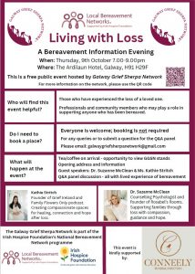 CRY Ireland are delighted to be one of 28 organisations within the Galway Grief Sherpa Network (GGSN) and part of the organising committee hosting this FREE “Living with Loss” Public event in Galway this coming Thursday evening. We look forward to welcoming our Guest Speakers Kathie Stritch, Founder of Grief Ireland and Family Flowers Only