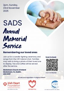 ✨2025 𝘼𝙣𝙣𝙪𝙖𝙡 𝙎𝘼𝘿𝙎 𝙈𝙚𝙢𝙤𝙧𝙞𝙖𝙡 𝙎𝙚𝙧𝙫𝙞𝙘𝙚 ✨ Monkstown Church of Ireland Church are hosting their annual memorial service to remember children and young adults lost suddenly to a heart condition or sudden cardiac death. This year, it takes place at 𝟮𝗽𝗺, 𝗦𝘂𝗻𝗱𝗮𝘆, 𝟮𝟯𝗿𝗱 𝗡𝗼𝘃𝗲𝗺𝗯𝗲𝗿 𝟮𝟬𝟮𝟱 in Monkstown, Church of Ireland Church, Monkstown, Co Dublin (A94