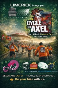 Ready for something epic? This is it     Brought to you by Limerick Cycling Club, this is more than a spin — it’s a full-scale experience built on legacy, community, and serious energy. Join the 𝗖𝘆𝗰𝗹𝗲 𝗳𝗼𝗿 𝗔𝘅𝗲𝗹 - supporting CRY Ireland, Mid Western Cancer Foundation and the IRFU Charitable Trust.   Start & Finish: